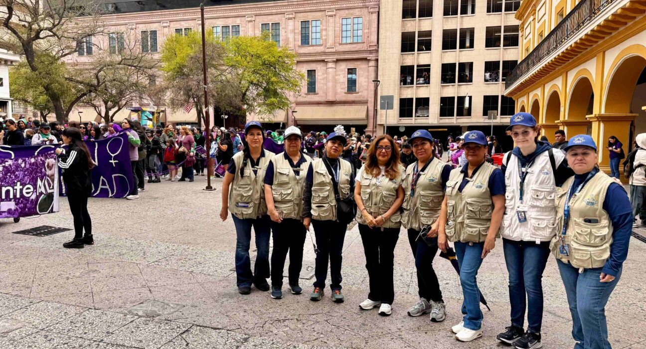 Las observadoras de la CEDHNL pueden ser identificadas por sus chalecos institucionales con los logotipos del organismo, gorras y gafetes oficiales, lo que permite a las personas manifestantes reconocer fácilmente al personal que se encuentra realizando estas labores.