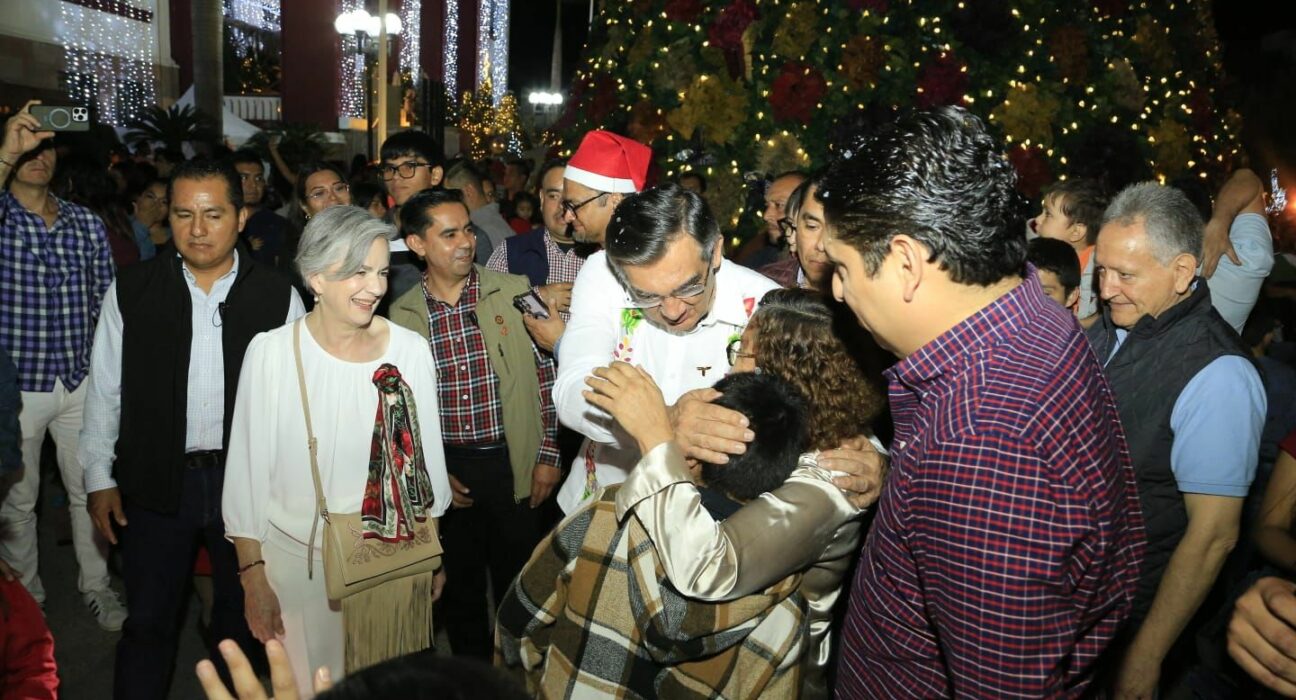 “Un abrazo sincero como siempre de su amigo el gobernador del estado, felices fiestas a todos”, agregó, luego de encender el gigantesco pino, lo que dio paso también a un espectacular show de pirotécnica, el concierto de la Banda de Música y hasta una “nevada”.