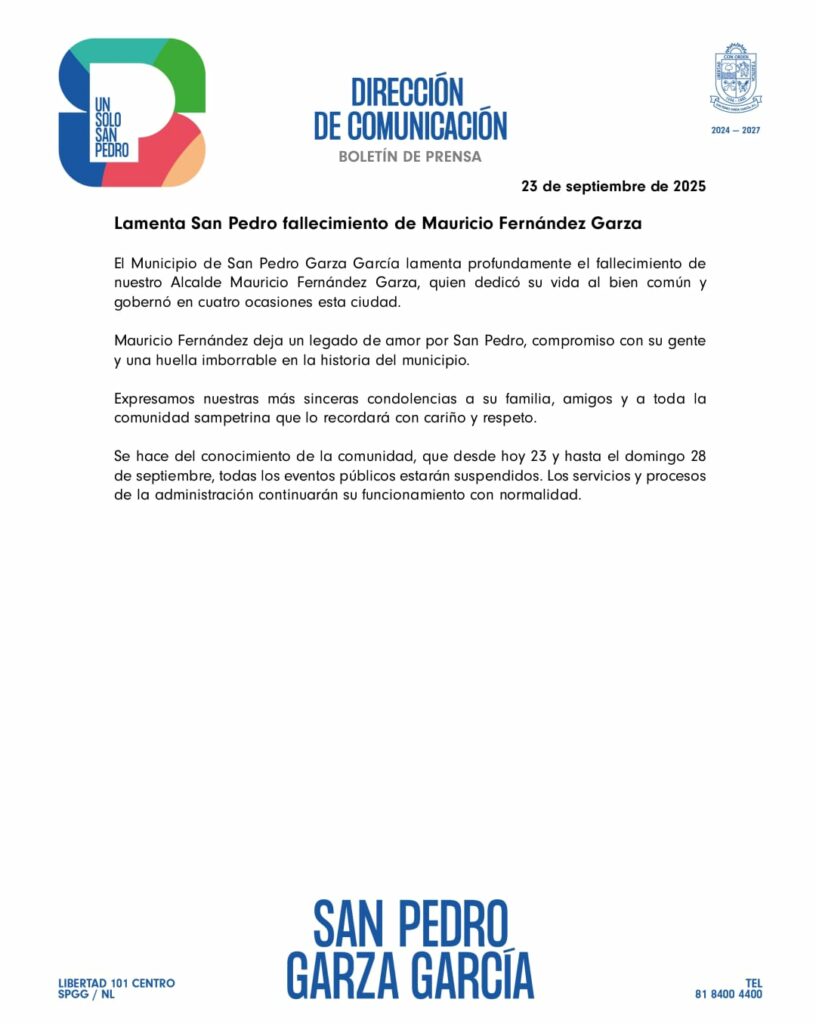 Monterrey, Nuevo León, 23 de Septiembre.‑ El empresario y político Mauricio Fernández Garza falleció la noche del lunes tras mas de una década de enfrentar el cáncer.