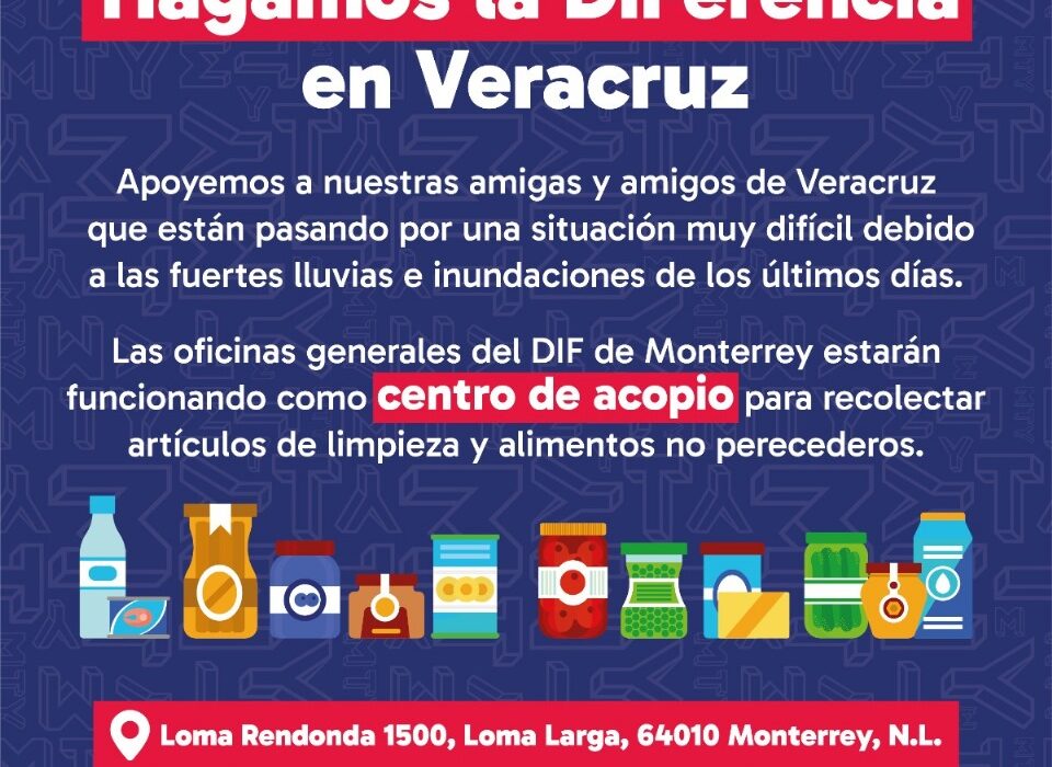El punto de recolección se encuentra en las oficinas generales del DIF Monterrey, ubicadas en Calle Loma Redonda #1500, Colonia Loma Larga, y estará habilitado a partir de hoy, abierto las 24 horas del día, para recibir artículos de limpieza y alimentos no perecederos.