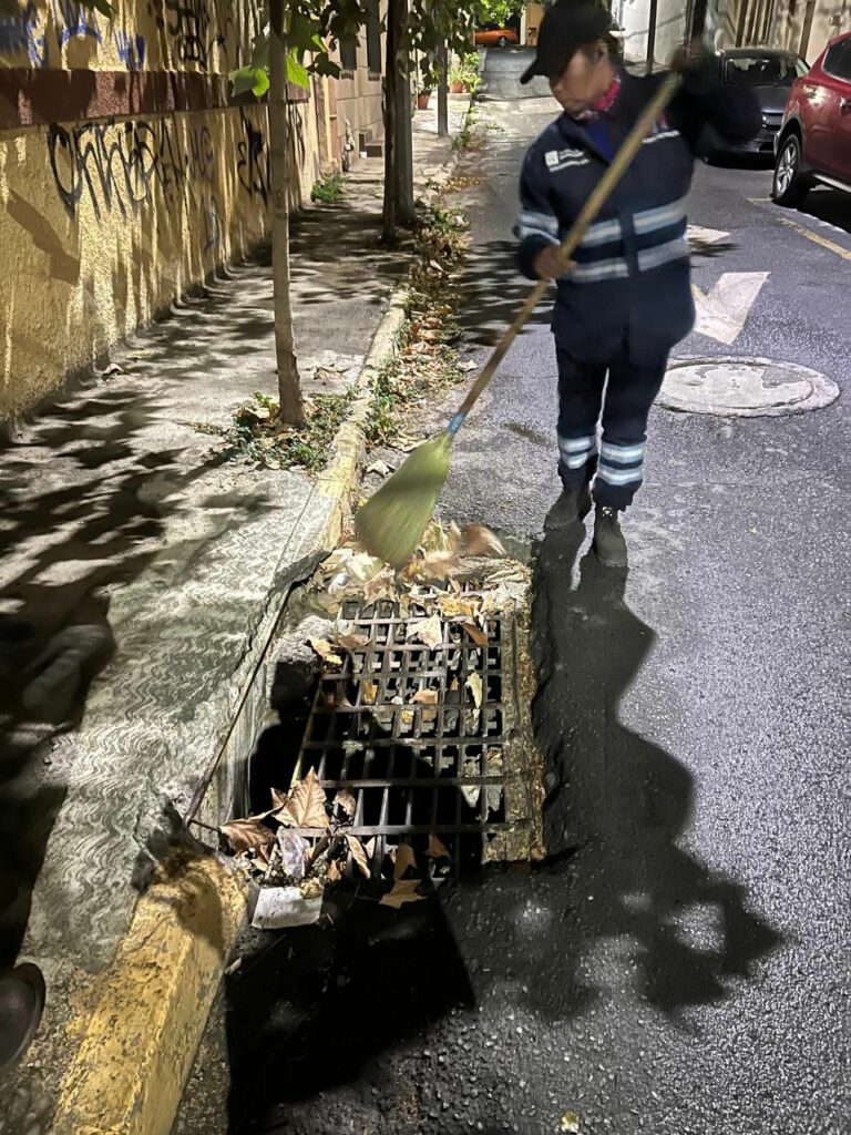 Ante las lluvias registradas desde anoche y debido a que el pronóstico se extiende en las próximas horas, el personal continúa retirando la basura de los desagües.