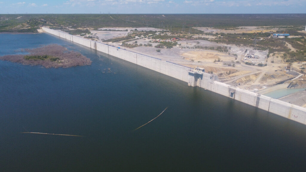 La presa, construida con concreto compactado con rodillo, cuenta con una cortina de mil 950 metros de longitud y una altura de 45 metros, lo que la convierte en la cortina más larga del continente.