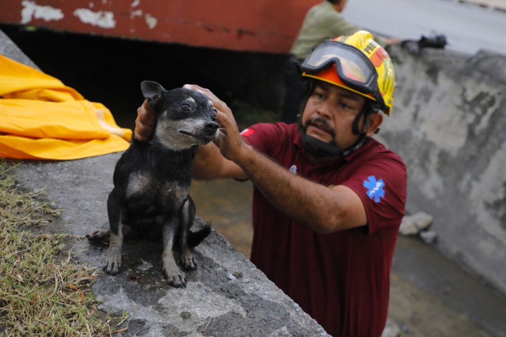 Al momento en que de nueva cuenta aparecieron las intensas lluvias, personal de Protección Civil de Escobedo rescató a un perro pequeño que cayó al fondo de un canal pluvial