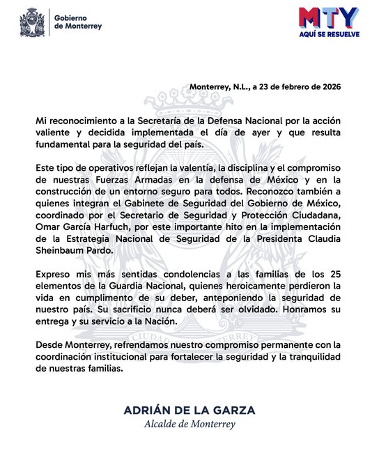 “Aquí con el Ejército y la Guardia Nacional estamos muy bien (…) en Nuevo León no hay nada de qué preocuparse, estamos blindados”, al asegurar que febrero de 2026 es el mes más tranquilo de los últimos 15 años.
