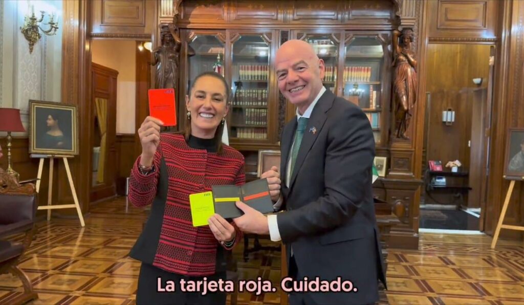 El presidente de la FIFA obsequió a la Presidenta de México las tarjetas oficiales de la FIFA que utilizarán los árbitros durante la justa deportiva.