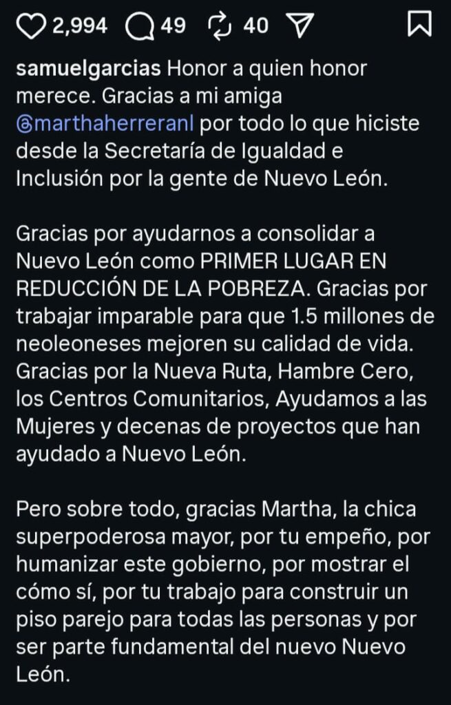 Nobleza obliga y el gobernador Samuel García le hizo un justo reconocimiento a la ex secretaria de Igualdad e Inclusión en su cuenta de Instagram, Martha Herrera, quien le entregó su renuncia el pasado lunes para dedicarse de lleno a las tareas partidistas de Movimiento Ciudadano en Monterrey.
