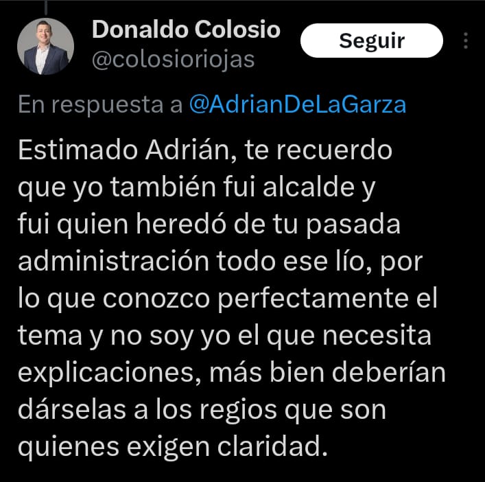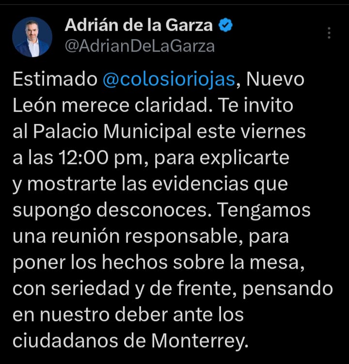 Adrián le mandó un mensaje a Colosio en el que invoca que Nuevo León “merece claridad”, por lo que lo conmina a sostener una reunión responsable para revisar los contratos en un encuentro que tendría lugar mañana viernes a las 12:00.