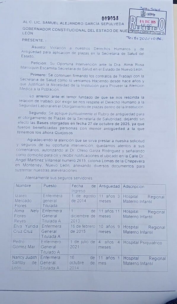 Ante el riesgo de que les aplicaran el despido mediante la rescisión de contratos a un grupo de 13 empleados de la Secretaría de Salud, algunos hasta con 11 años de antigüedad, el gobernador Samuel García atendió una petición de los afectados y pidió a la titular de la dependencia, Alma Rosa Marroquín, que revisara el caso.