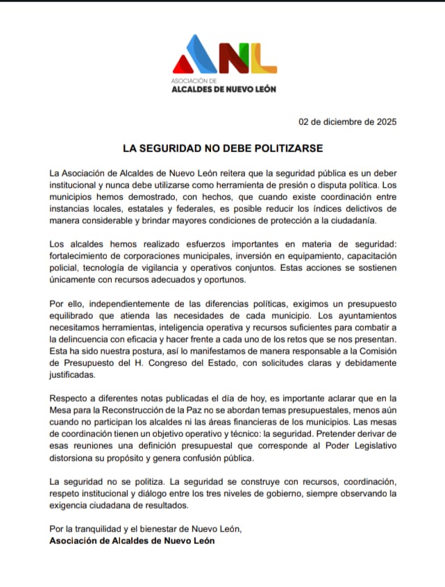 Ante ello, la AAM en la que están alcaldes de todos los partidos, con excepción de los de Movimiento Ciudadano, difundieron un comunicado-desplegado que se publica hoy miércoles en diversos medios de comunicación en el que piden no politizar la seguridad. Aquí la versión completa:
