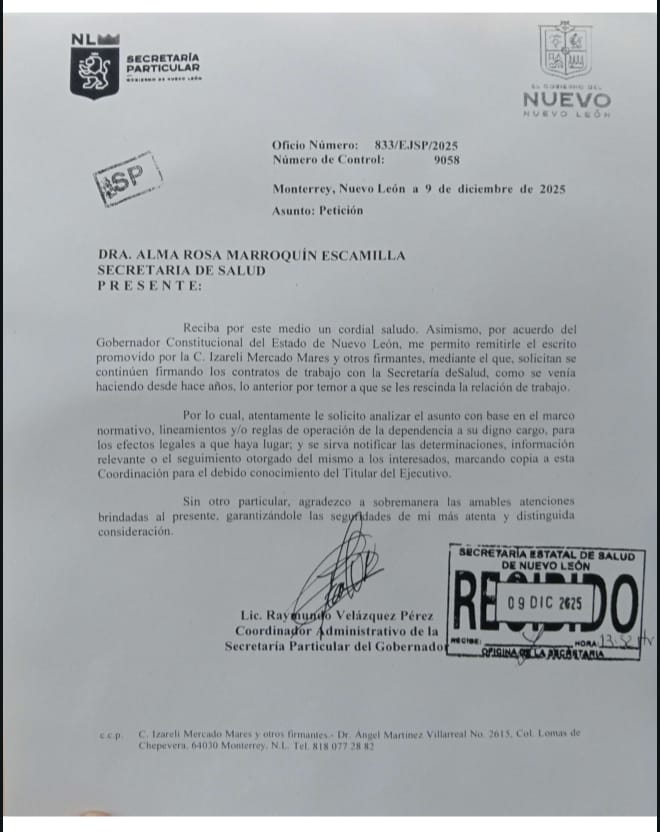 Desde la oficina del gobernador Samuel García salió la petición para que se revise el caso de 13 trabajadores de la Secretaría de Salud, quienes se inconformaron luego de que fueron “brincados” en un proceso de basificación, pese a que varios de ellos rebasan los 11 años de cobrar su sueldo por honorarios.