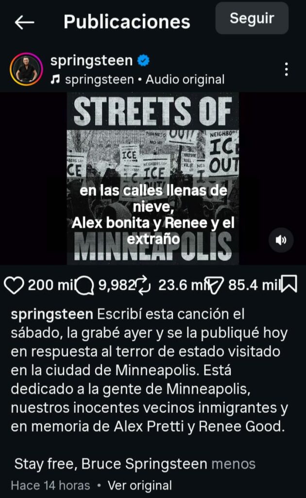 A través de su cuenta de Instagram, uno de los críticos más duros de Donald Trump en sus discursos y redes sociales, ayer también enfocó su música y creatividad al lanzar una canción para Minneapolis y sus dos ciudadanos asesinados por el ICE este mes de enero.