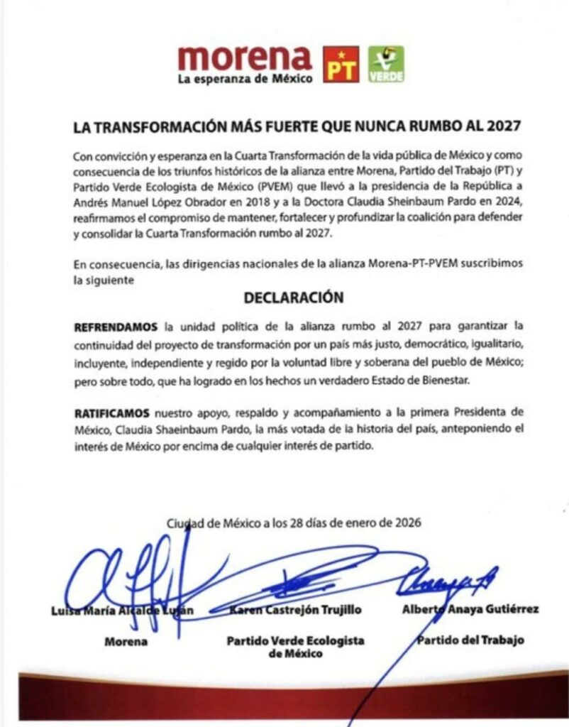 La carta de intención firmada por los tres líderes nacionales de los partidos que conforman la 4T y que han ido juntos en las dos últimas elecciones presidenciales (2018 y 2024) fue hecha pública la tarde de este miércoles, lo que implica que sellan el pacto para ir juntos por las gubernaturas.