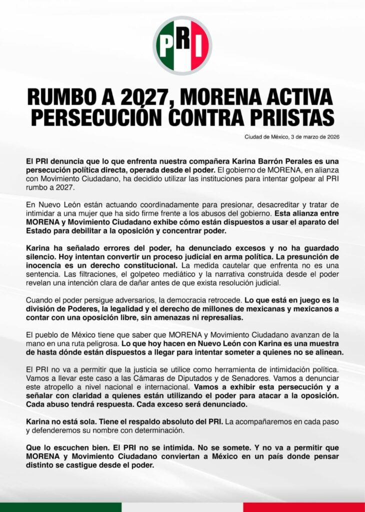 Si bien el comunicado divulgado hasta este martes, dos días después de la orden de aprehensión ejecutada por policías de la Agencia Federal Ministerial en contra de Barrón, no está firmado al calce, sí se denuncia que Morena en alianza con Movimiento Ciudadano ha decidido utilizar las instituciones de justicia para golpear al tricolor rumbo a las elecciones de 2027.